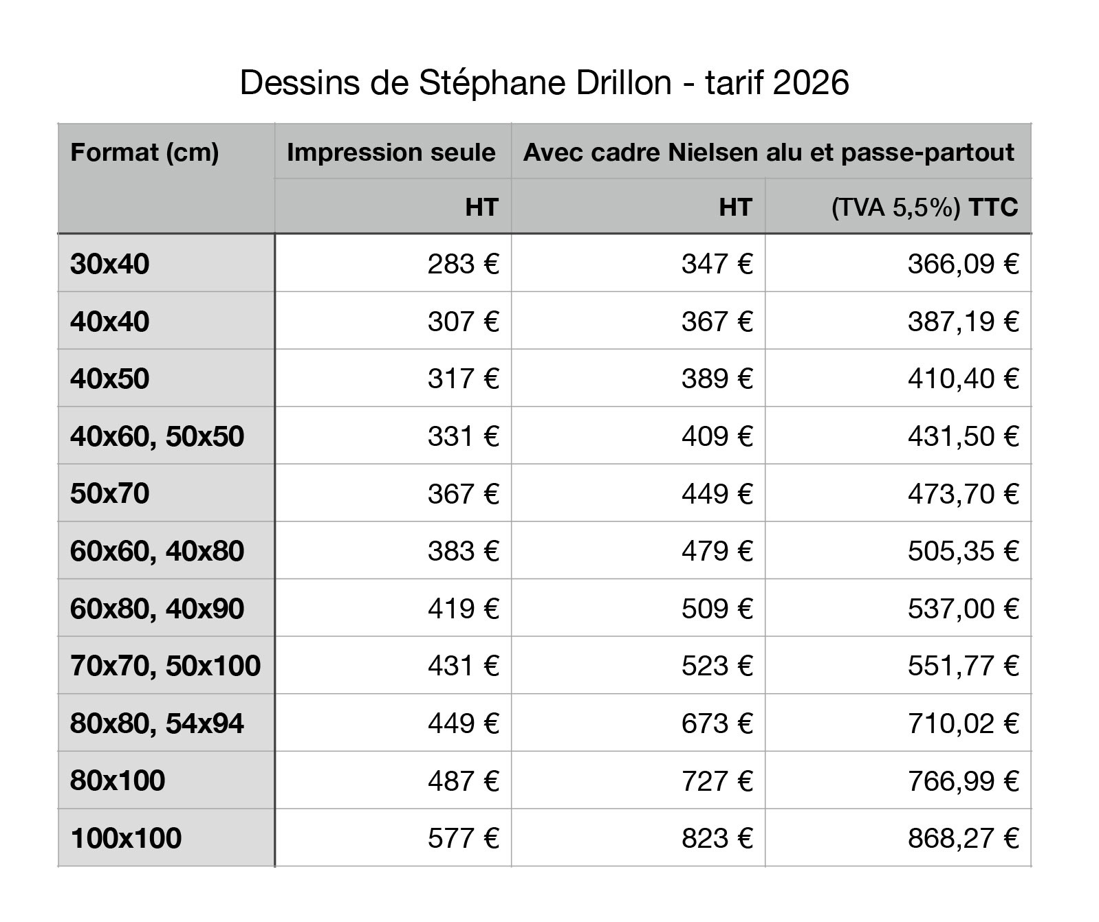 Tous les dessins du site peuvent être vendus, dans la limite où le tirage maximal de 5 exemplaires numérotés et signés n'est pas atteint. Vous trouverez ci-dessous un exemple de dessin imprimé et encadré, suivi du tarif. Les prix (en Euros) dépendent du format et le transport est en sus. Pour les frais de port, les autres formats ou toute autre demande, merci de me contacter.